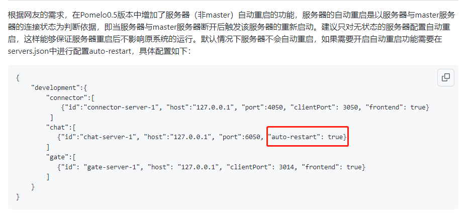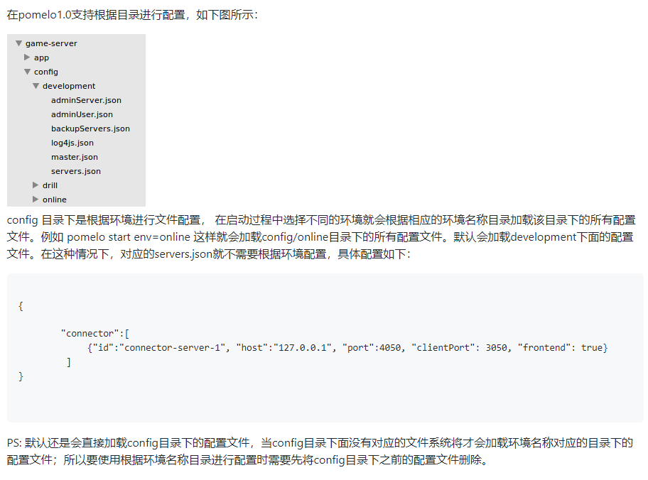 | { "development":{ "connector":[ {"id":"connector-server-1", "host":"127.0.0.1", "port":4050, "clientPort": 3050, "frontend": true, "cpu": 2} ] "chat":[ {"id":"chat-server-1", "host":"127.0.0.1", "port":6050, "cpu": 1} ] "gate":[ {"id": "gate-server-1", "host": "127.0.0.1", "clientPort": 3014, "frontend": true, "cpu": 3} ] } }