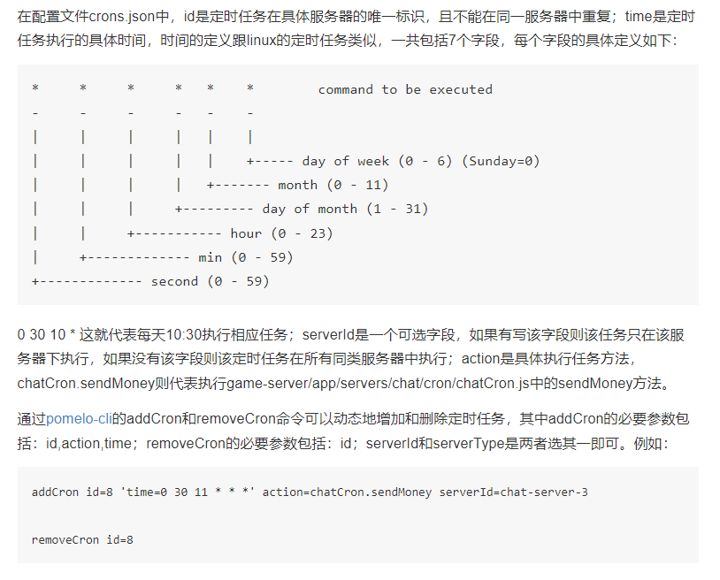 用户能够通过配置文件或者pomelo-cli的命令addCron和removeCron对定时任务进行动态调度。 定时任务是针对具体服务器而言,例如需要在chat服务器中配置定时任务: