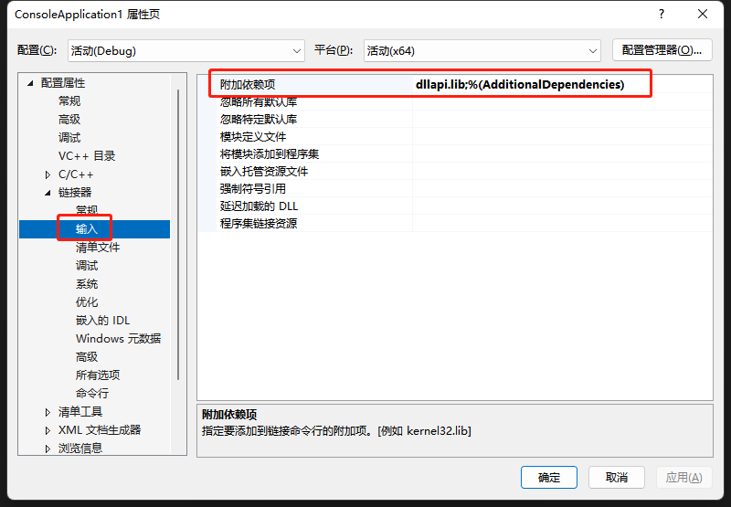 dllapi.lib所在的目录。项目->属性->配置属性->链接器->输入-> 在“附加依赖项”里添加