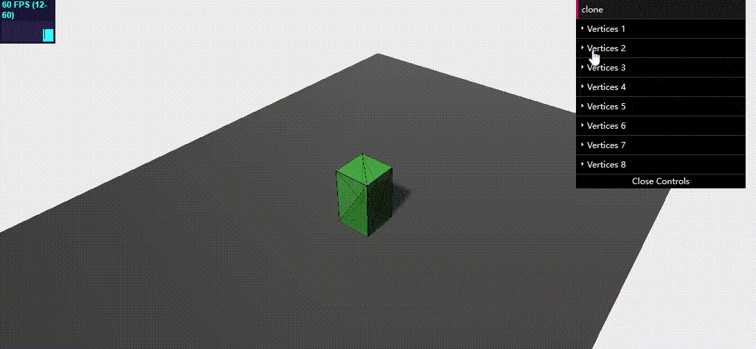 return controls; } var controlPoints = []; controlPoints.push(addControl(3, 5, 3)); controlPoints.push(addControl(3, 5, 0)); controlPoints.push(addControl(3, 0, 3)); controlPoints.push(addControl(3, 0, 0)); controlPoints.push(addControl(0, 5, 0)); controlPoints.push(addControl(0, 5, 3)); controlPoints.push(addControl(0, 0, 0)); controlPoints.push(addControl(0, 0, 3)); for (var i = 0; i < 8; i++) { f1 = gui.addFolder('Vertices ' + (i + 1)); f1.add(controlPoints[i], 'x', -10, 10); f1.add(controlPoints[i], 'y', -10, 10); f1.add(controlPoints[i], 'z', -10, 10); }