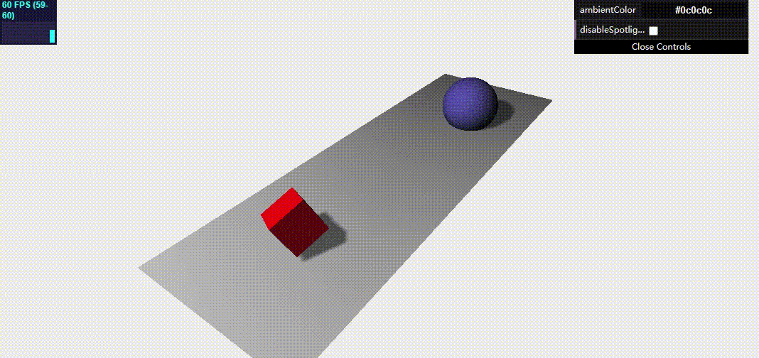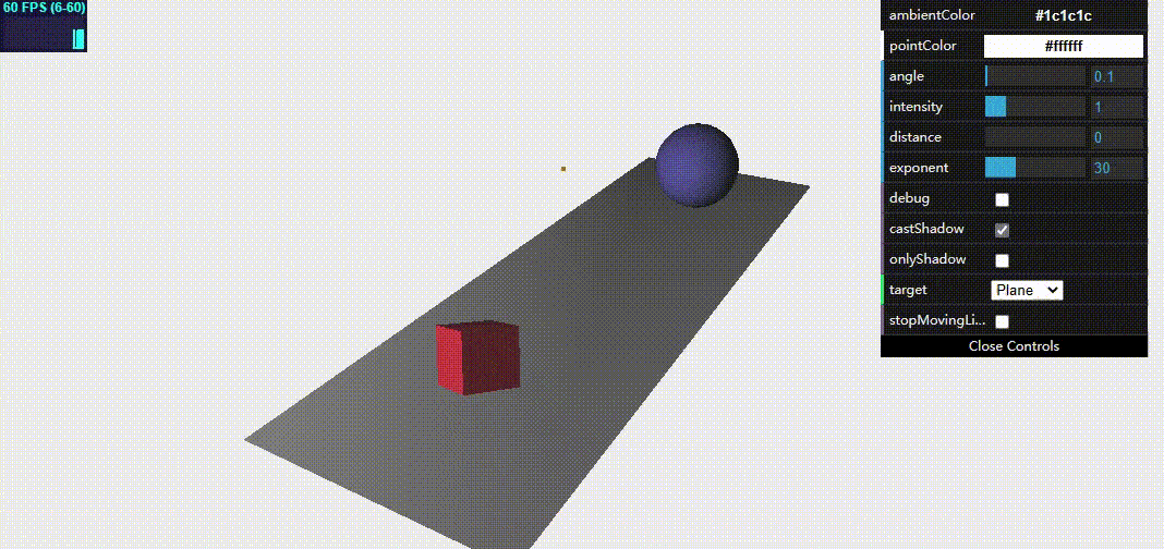 var spotLight0 = new THREE.SpotLight(0xcccccc); spotLight0.position.set(-40, 60, -10); spotLight0.intensity = 0.1; spotLight0.lookAt(plane); scene.add(spotLight0);