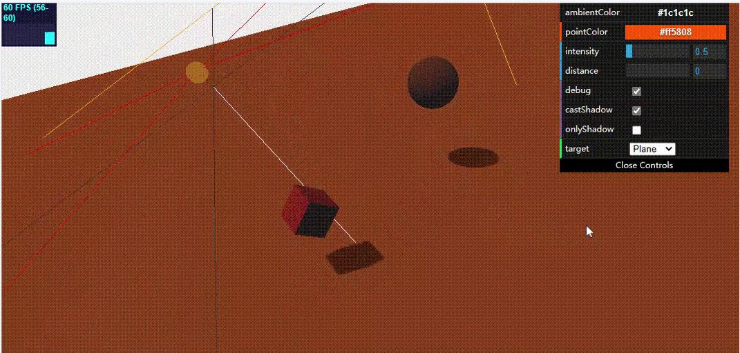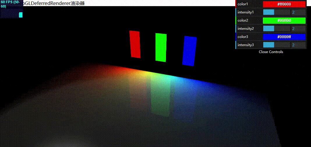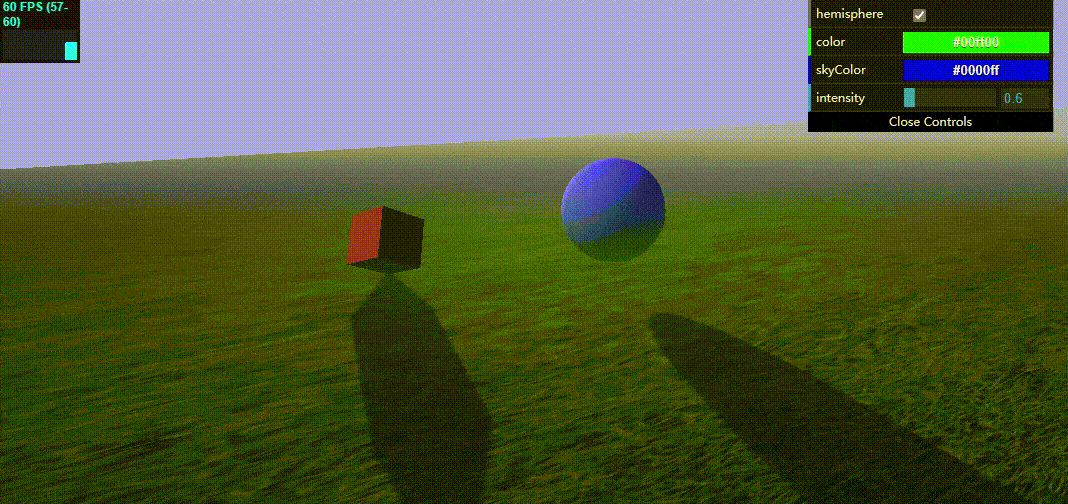 var controls = new function () { this.color1 = 0xff0000; this.intensity1 = 2; this.color2 = 0x00ff00; this.intensity2 = 2; this.color3 = 0x0000ff; this.intensity3 = 2; }; var gui = new dat.GUI(); gui.addColor(controls, 'color1').onChange(function (e) { areaLight1.color = new THREE.Color(e); planeGeometry1Mat.color = new THREE.Color(e); scene.remove(plane1); plane1 = new THREE.Mesh(planeGeometry1, planeGeometry1Mat); plane1.position.copy(areaLight1.position); scene.add(plane1);