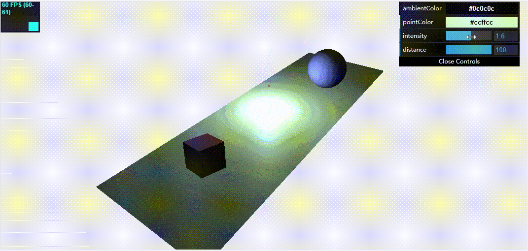 }); gui.add(controls, 'intensity1', 0, 5).onChange(function (e) { areaLight1.intensity = e; }); gui.addColor(controls, 'color2').onChange(function (e) { areaLight2.color = new THREE.Color(e); planeGeometry2Mat.color = new THREE.Color(e); scene.remove(plane2); plane2 = new THREE.Mesh(planeGeometry2, planeGeometry2Mat); plane2.position.copy(areaLight2.position); scene.add(plane2); }); gui.add(controls, 'intensity2', 0, 5).onChange(function (e) { areaLight2.intensity = e; }); gui.addColor(controls, 'color3').onChange(function (e) { areaLight3.color = new THREE.Color(e); planeGeometry3Mat.color = new THREE.Color(e); scene.remove(plane3); plane3 = new THREE.Mesh(planeGeometry1, planeGeometry3Mat); plane3.position.copy(areaLight3.position); scene.add(plane3); }); gui.add(controls, 'intensity3', 0, 5).onChange(function (e) { areaLight3.intensity = e; });