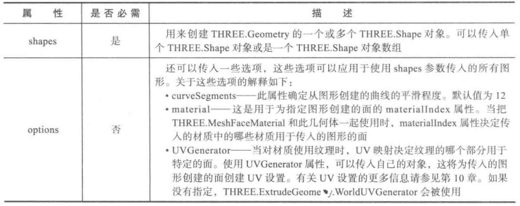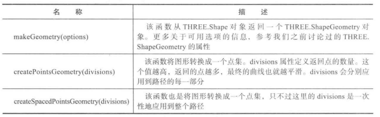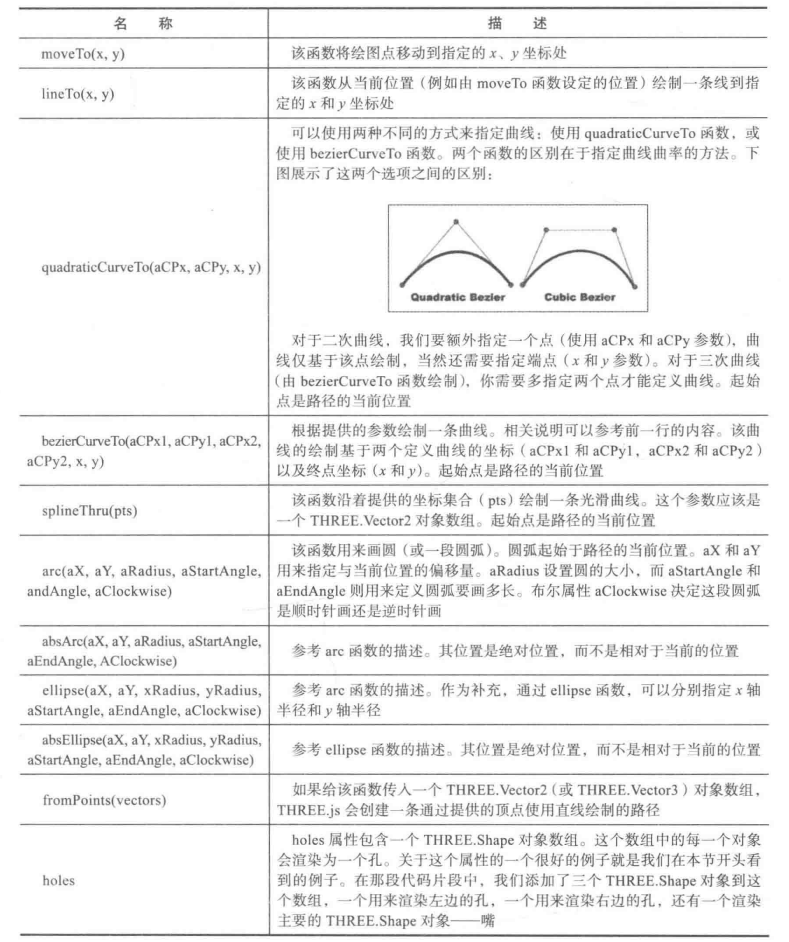 上面传入参数最重要的就是shapes,THREE.Shape对象的创建。它可以用来创建图形,所以下面介绍它的绘图函数。