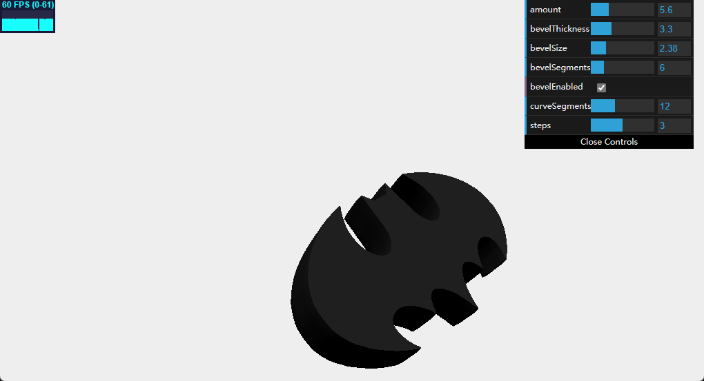 var guiSphere2 = gui.addFolder("Sphere2"); guiSphere2.add(controls, "sphere2PosX", -15, 15).onChange(function () { sphere2.position.set(controls.sphere2PosX, controls.sphere2PosY, controls.sphere2PosZ) }); guiSphere2.add(controls, "sphere2PosY", -15, 15).onChange(function () { sphere2.position.set(controls.sphere2PosX, controls.sphere2PosY, controls.sphere2PosZ) }); guiSphere2.add(controls, "sphere2PosZ", -15, 15).onChange(function () { sphere2.position.set(controls.sphere2PosX, controls.sphere2PosY, controls.sphere2PosZ) }); guiSphere2.add(controls, "sphere2Scale", 0, 10).onChange(function (e) { sphere2.scale.set(e, e, e) }); guiSphere2.add(controls, "actionSphere", ["subtract", "intersect", "union", "none"]);