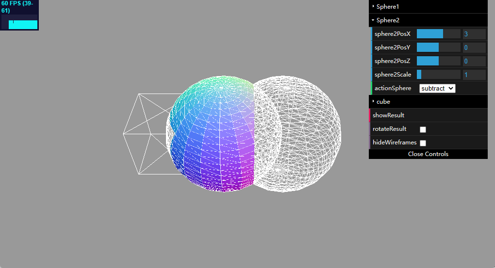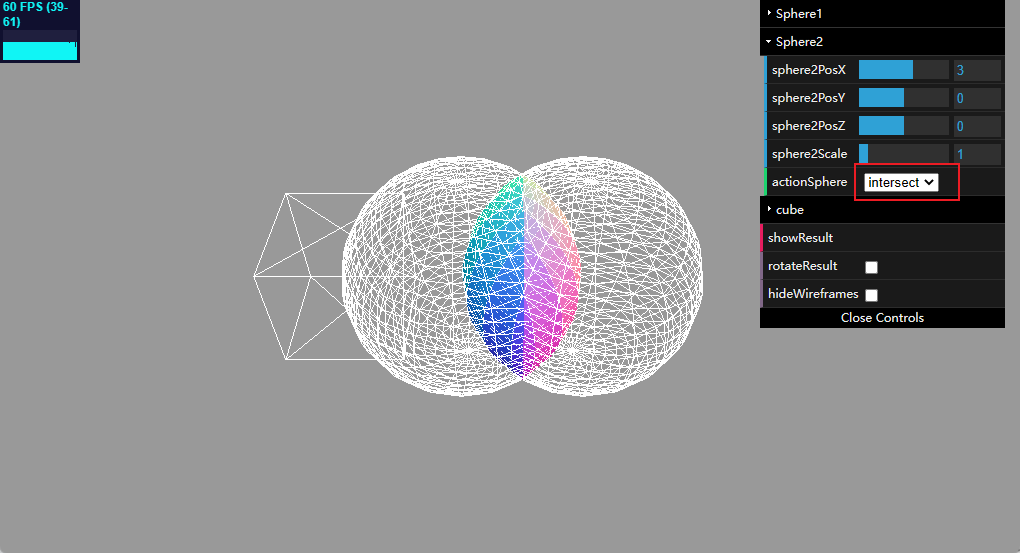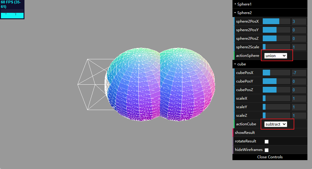 gui.add(controls, "showResult"); gui.add(controls, "rotateResult"); gui.add(controls, "hideWireframes").onChange(function () { if (controls.hideWireframes) { sphere1.material.visible = false; sphere2.material.visible = false; cube.material.visible = false; } else { sphere1.material.visible = true; sphere2.material.visible = true; cube.material.visible = true; } });