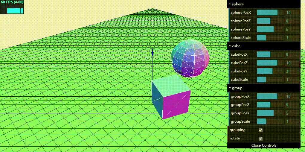 var cubeFolder = gui.addFolder("group"); cubeFolder.add(controls, "groupPosX", -20, 20).onChange(function (e) { group.position.x = e; }); cubeFolder.add(controls, "groupPosZ", -20, 20).onChange(function (e) { group.position.z = e; }); cubeFolder.add(controls, "groupPosY", -20, 20).onChange(function (e) { group.position.y = e; }); cubeFolder.add(controls, "groupScale", 0, 3).onChange(function (e) { group.scale.set(e, e, e); });