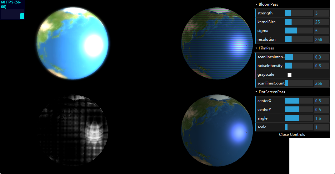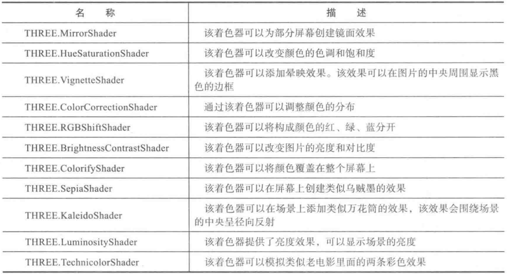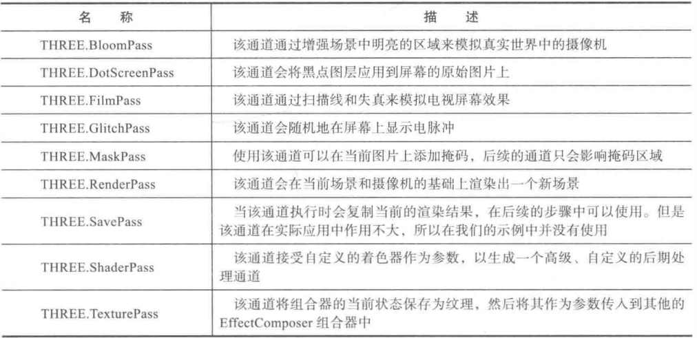 var composer = new THREE.EffectComposer(webGLRenderer); composer.addPass(renderPass); composer.addPass(brightness); composer.addPass(sepia); composer.addPass(mirror); composer.addPass(colorify); composer.addPass(colorCorrection); composer.addPass(rgbShift); composer.addPass(vignette); composer.addPass(hue); composer.addPass(kal); composer.addPass(lum); composer.addPass(techni); composer.addPass(unpack); composer.addPass(effectCopy);