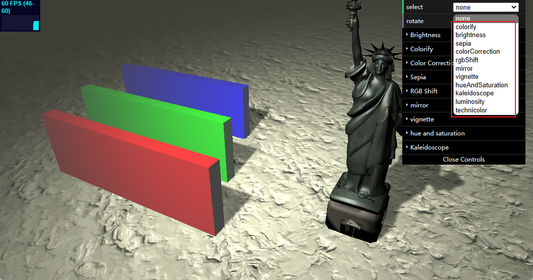 var gui = new dat.GUI(); gui.add(controls, "select", ['none', "colorify", 'brightness', 'sepia', 'colorCorrection', 'rgbShift', 'mirror', 'vignette', 'hueAndSaturation', 'kaleidoscope', 'luminosity', 'technicolor']).onChange(controls.switchShader); gui.add(controls, "rotate");