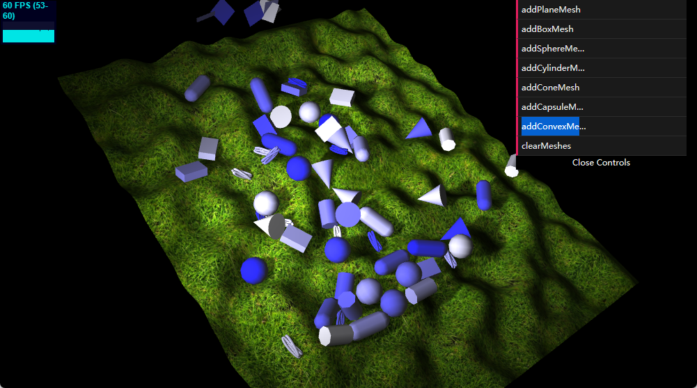 }), controls.sphereFriction, controls.sphereRestitution ) , 0.1); box.castShadow = true; box.receiveShadow = true; box.position.set( Math.random() * 50 - 25, 20 + Math.random() * 5, Math.random() * 5 ); meshes.push(box); scene.add(box); } }; };