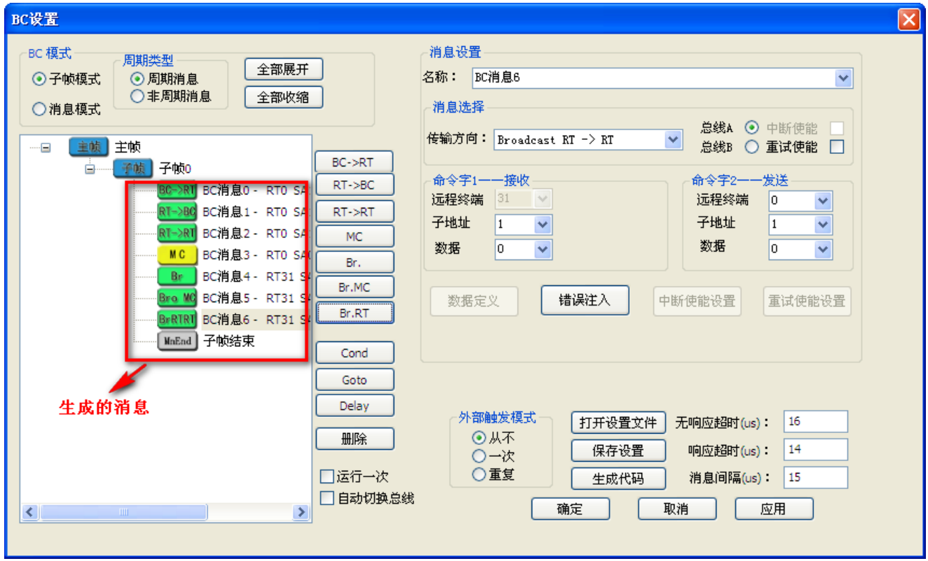 if (bcMsgType == BC_BLOCK_TYPE_MSG_RTRT) { if (0 == P(rtType)[i]) { bc_block.cmd_wd1 = CORE_Set_BC_Command(dev_num, channel_num, P(rtAddr)[i], P(rtType)[i], 0, P(subAddr)[i]); bc_block.cmd_wd2 = CORE_Set_BC_Command(dev_num, channel_num, P(rtAddr)[i + 1], P(rtType)[i + 1], 0, P(subAddr)[i + 1]); } else { bc_block.cmd_wd1 = CORE_Set_BC_Command(dev_num, channel_num, P(rtAddr)[i + 1], P(rtType)[i + 1], 0, P(subAddr)[i + 1]); bc_block.cmd_wd2 = CORE_Set_BC_Command(dev_num, channel_num, P(rtAddr)[i], P(rtType)[i], 0, P(subAddr)[i]); } } else { bc_block.cmd_wd1 = CORE_Set_BC_Command(dev_num, channel_num, P(rtAddr)[i], P(rtType)[i], 0, P(subAddr)[i]); } bc_block.im_gap = 10;